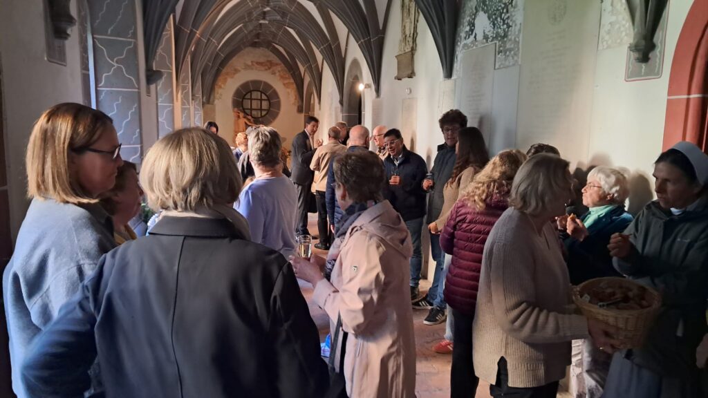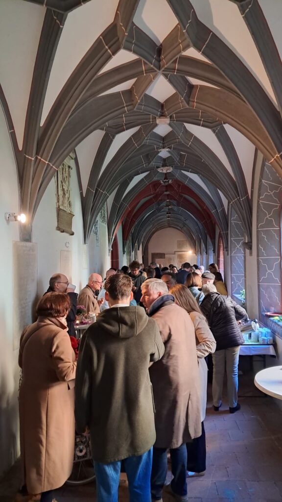 Nach dem Gottesdienst trafen sich zahlreiche Besucher bei Getränken und Gebäck im Kreuzgang. In entspannter Atmosphäre und bei lockeren Gesprächen klang der Vormittag fröhlich aus.
