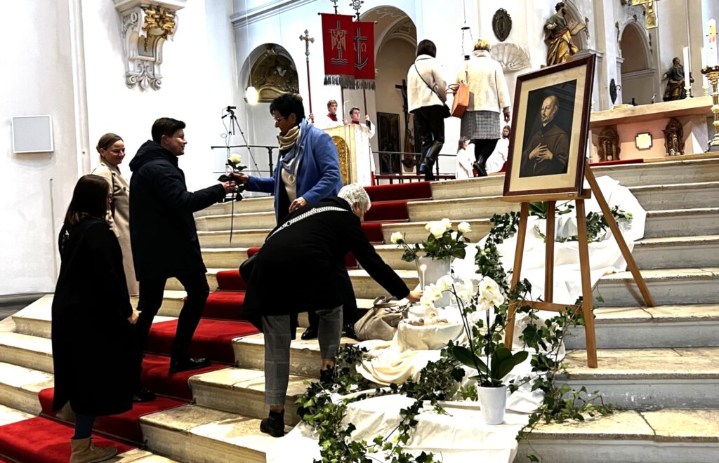 Ein langer Zug von Kirchengemeinderätinnen und -räten, die vor einem Gemälde Philipp Jeningens auf den Altarstufen weiße Rosen und Kerzen ablegen, eine fast unüberschaubare Schar von Ministrantinnen und Ministranten mit Fahnen und Leuchtern, festliche Klänge des Stiftschors von der Empore der voll besetzen Basilika – eindrucksvoller hätten Gläubige aus Ellwangen und der ganzen Region kaum zeigen können, wie stark die Verehrung von Pater Philipp Jeningen bis heute erhalten ist. Warum das so ist und was Pater Philipp Jeningen mit dem ehemaligen Bundespräsidenten Roman Herzog verbindet, darum ging es bei der großen Dekanatswallfahrt „zu unserem Pater Philipp“ im Jahr 1 nach der Seligsprechung.